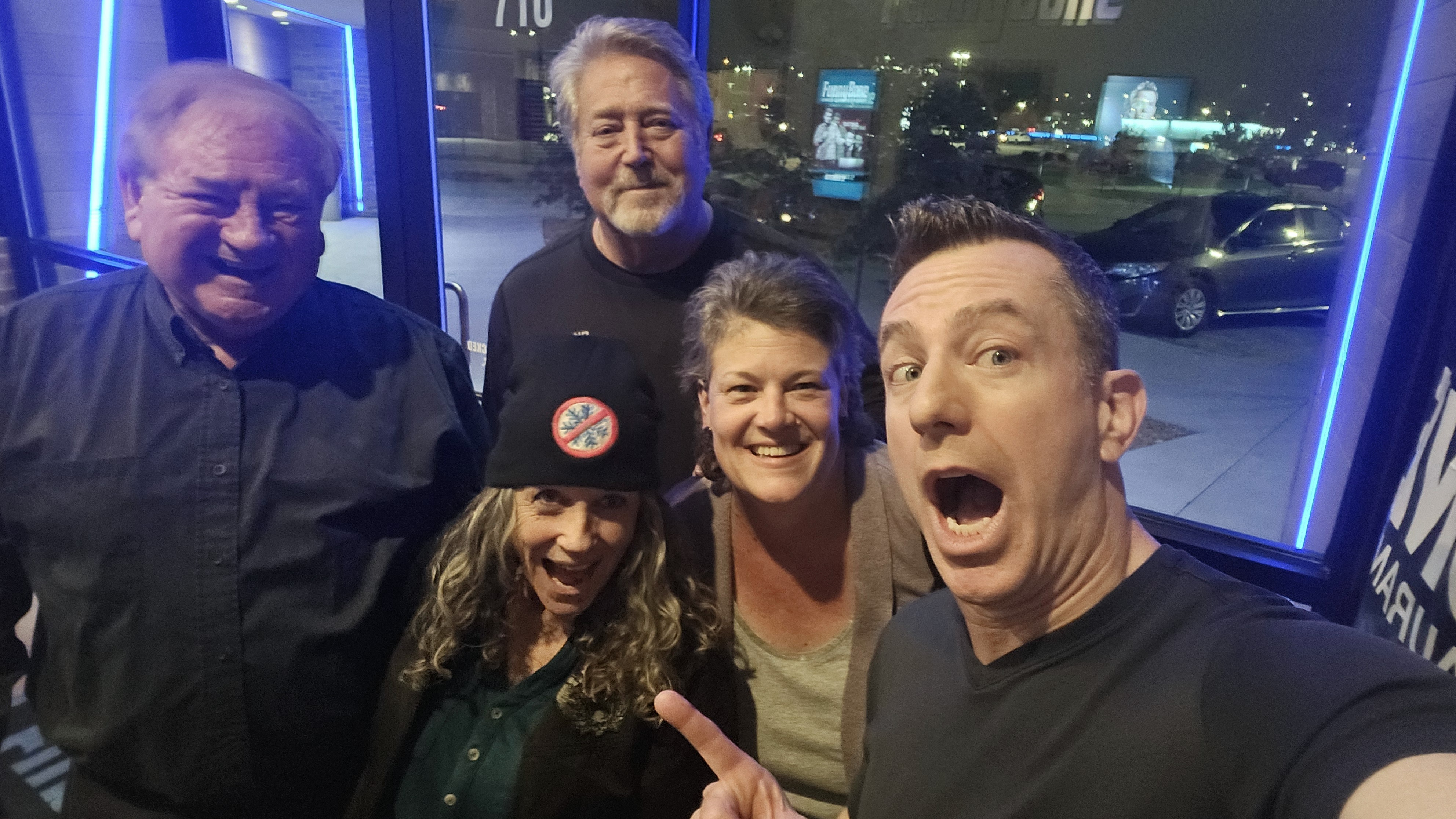 Jamie Lissow takes a selfie in Omaha with Tom Shillue Community Locals' members CB Michael & Joe Blue House with Tom Shillue Cameo birthday message recipients Mary Frances & Lisa